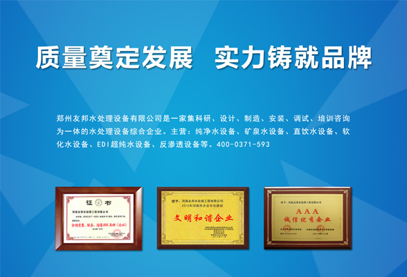 鄭州友邦水處理設(shè)備有限公司始創(chuàng)于2003年。自成立以來(lái),友邦始終堅(jiān)持以“客戶利益為保障”的原則,打造友邦口碑,備受客戶的認(rèn)可和信賴。鄭州友邦是一家專(zhuān)業(yè)從事水處理技術(shù)開(kāi)發(fā),設(shè)備制造生產(chǎn)及銷(xiāo)售的企業(yè)公司。嚴(yán)格的生產(chǎn)管理系統(tǒng)環(huán)環(huán)相扣,層層把關(guān)。從原材料選購(gòu)到現(xiàn)場(chǎng)調(diào)試安裝,鄭州友邦重視每個(gè)細(xì)節(jié)。公司以堅(jiān)持技術(shù)創(chuàng)新、質(zhì)量創(chuàng)優(yōu)、服務(wù)創(chuàng)佳的原則,以優(yōu)質(zhì)的產(chǎn)品和專(zhuān)業(yè)的服務(wù)實(shí)現(xiàn)我們的承諾:把您擁有的水變成您需要的水!